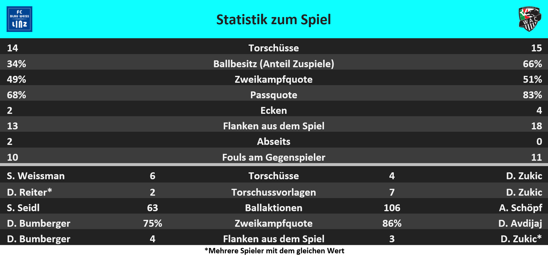 Dejan Zukic lieferte seinen siebenten Assist in dieser Saison der ADMIRAL Bundesliga ab – nur einen weniger als in der gesamten Vorsaison. Sechs seiner 17 BL-Assists lieferte er gegen den FC Blau-Weiß Linz ab – sein Höchstwert.