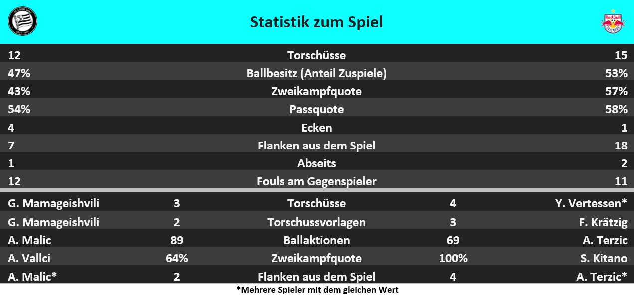 Der Grazer AK 1902 erzielte erstmals seit April 2005 fünf Tore in einem Spiel der ADMIRAL Bundesliga, damals bei einem 5:1 gegen den SV Mattersburg. Die Grazer trafen in diesem Spiel gleich oft wie in den letzten fünf BL-Spielen zusammen (5).